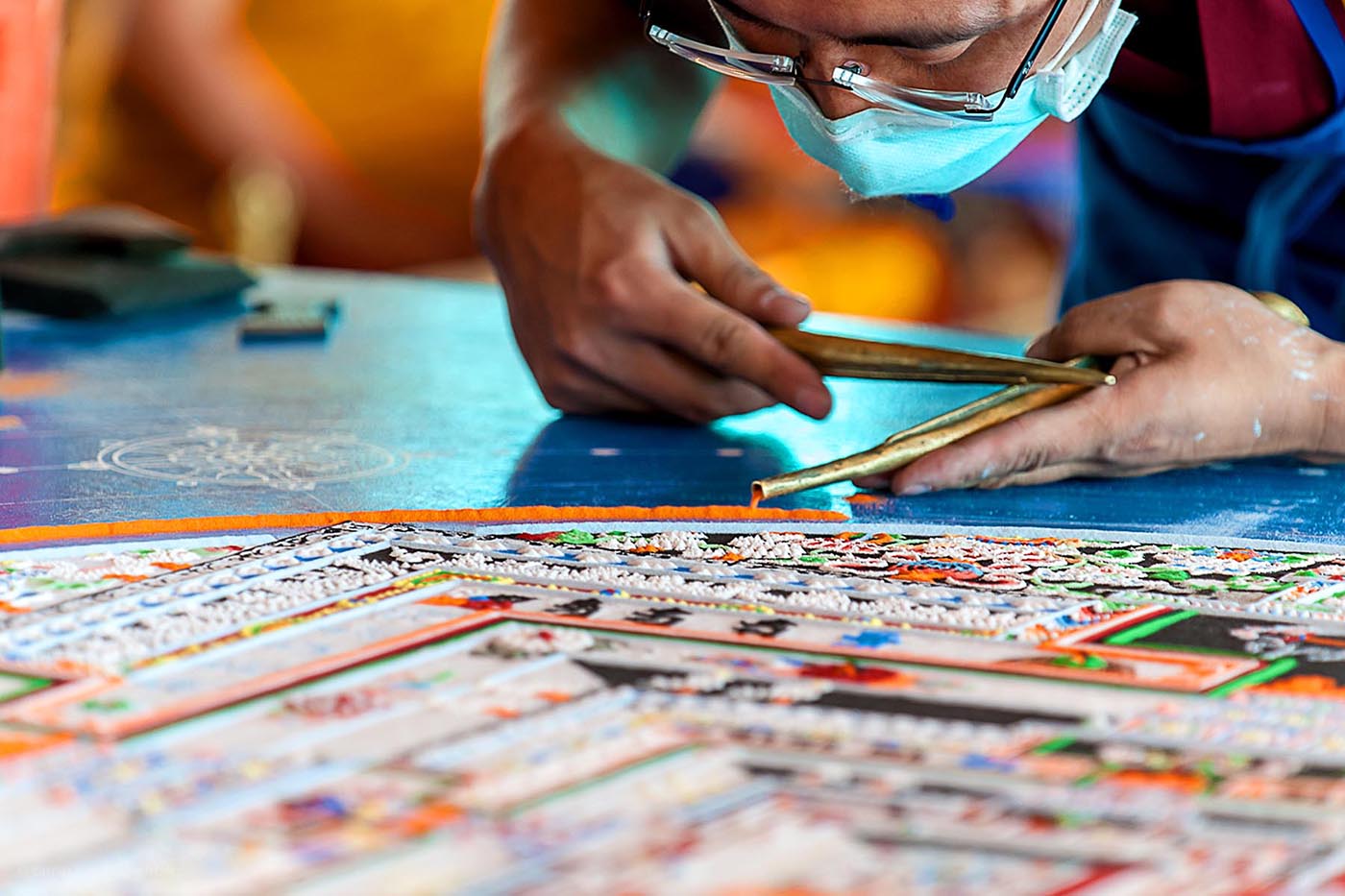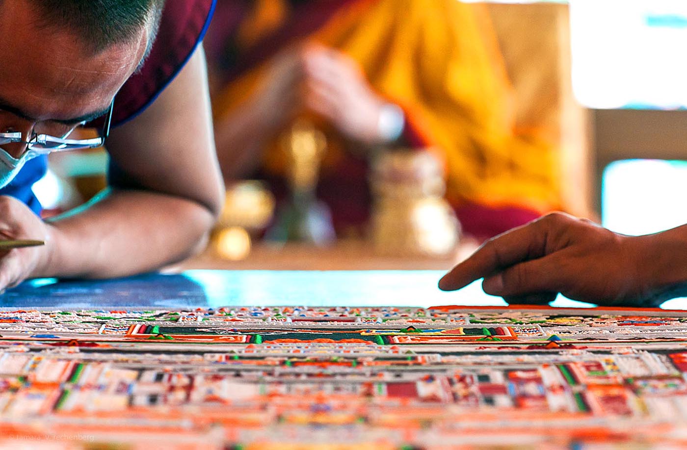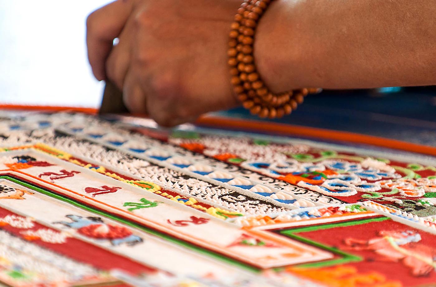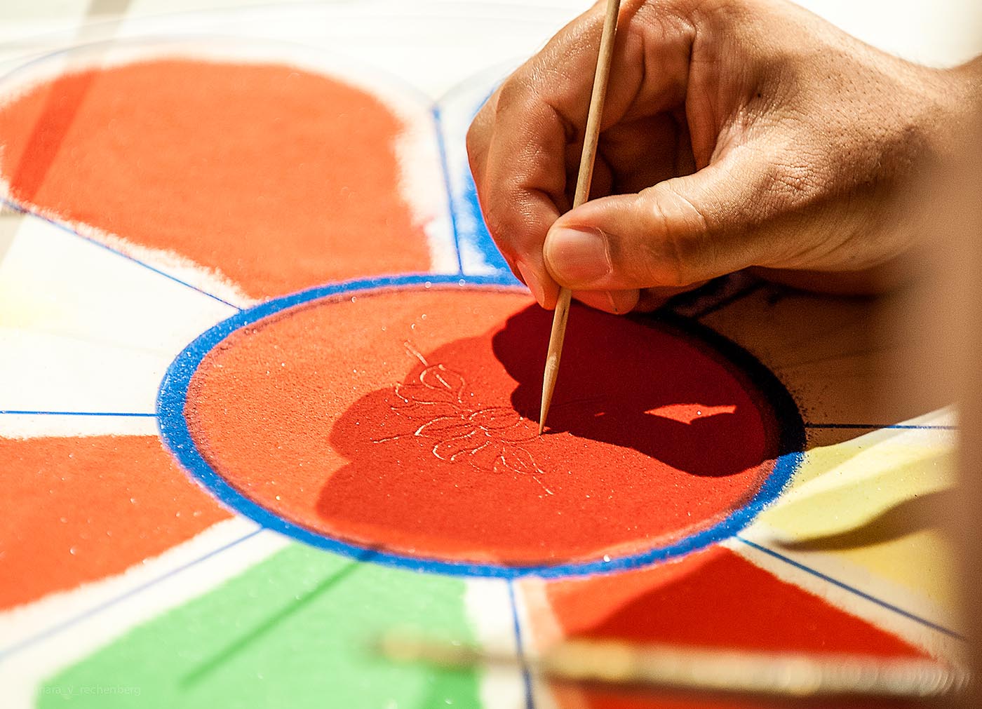 Im tibetischen Buddhismus werden von Mönchen in Form eines Mandala ein Sandbild gestaltet.