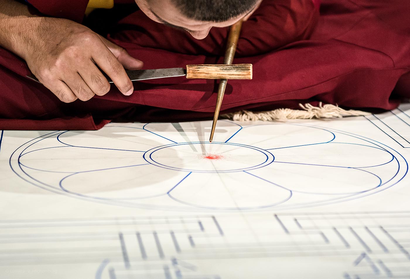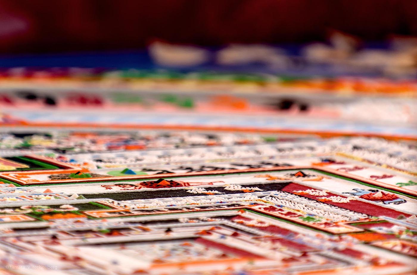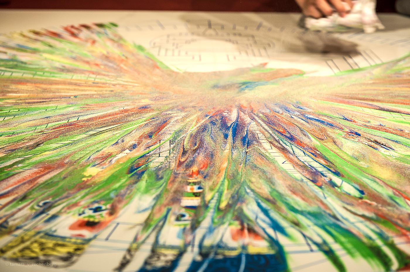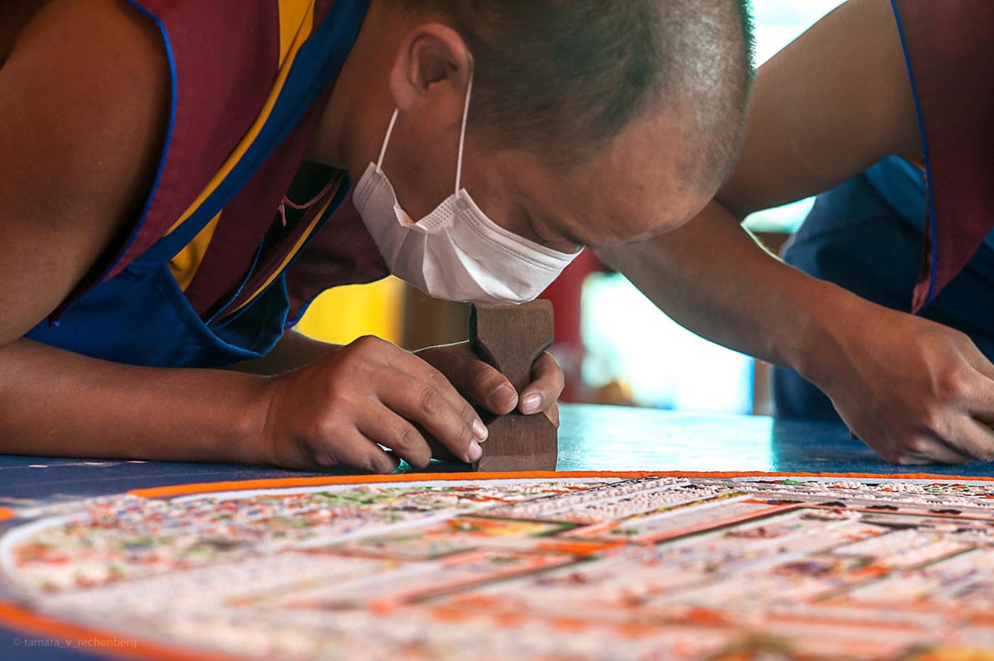 Im tibetischen Buddhismus werden von Mönchen in Form eines Mandala ein Sandbild gestaltet.