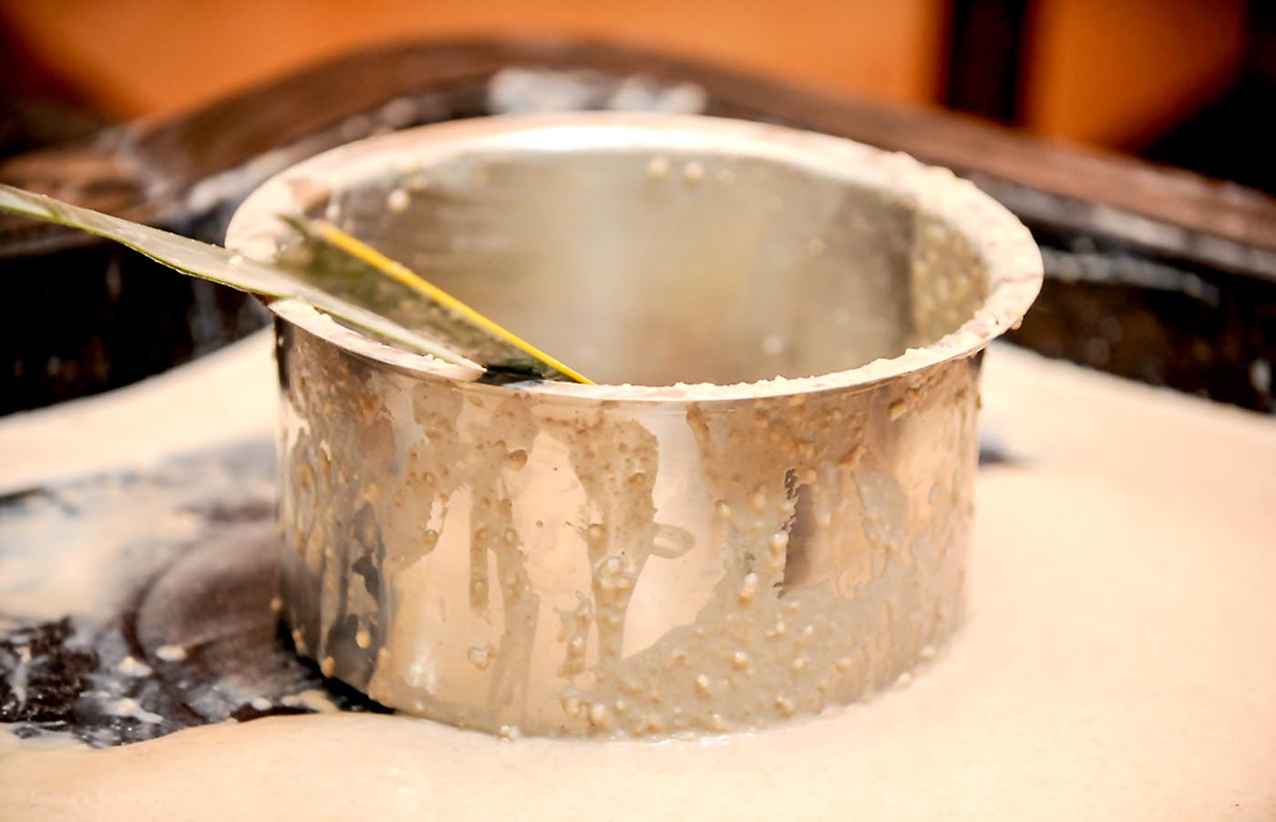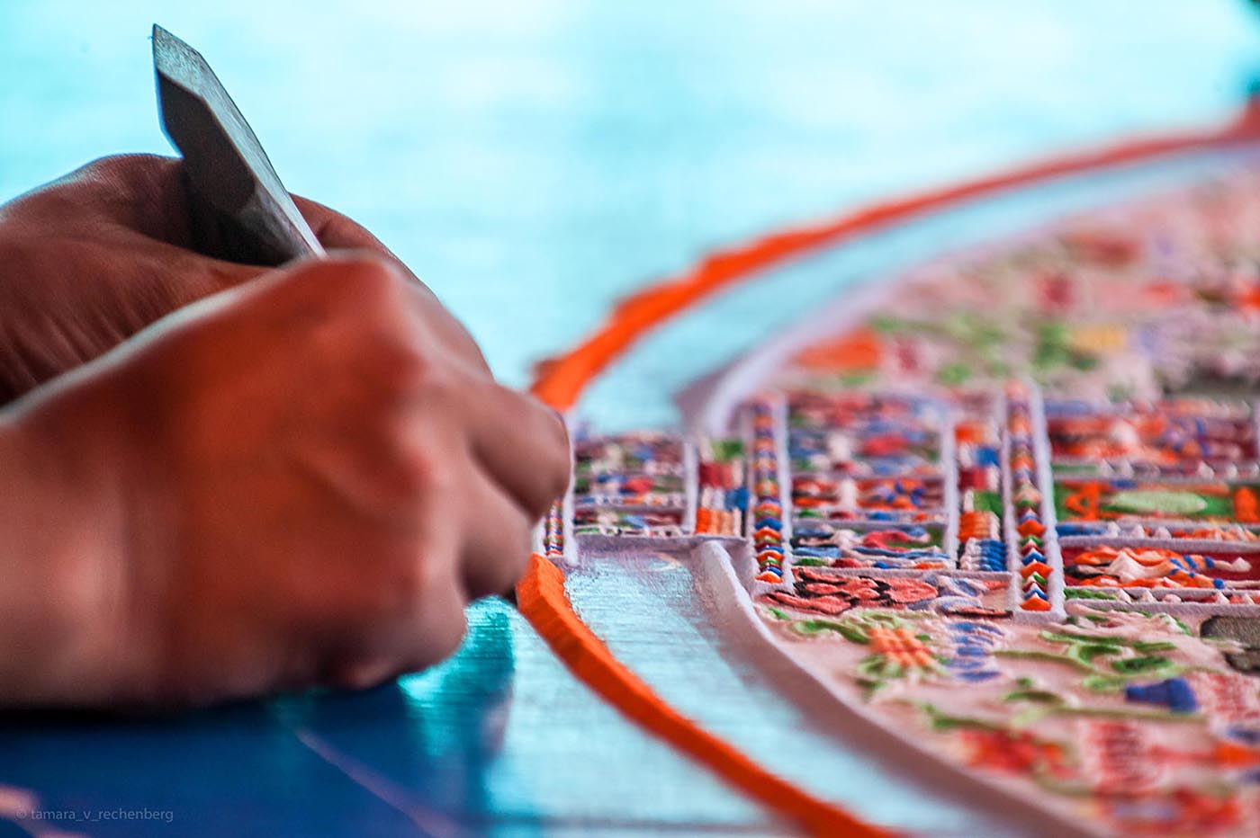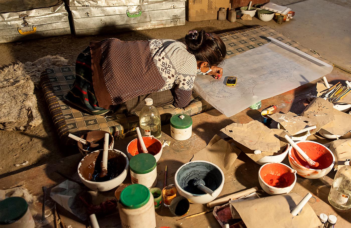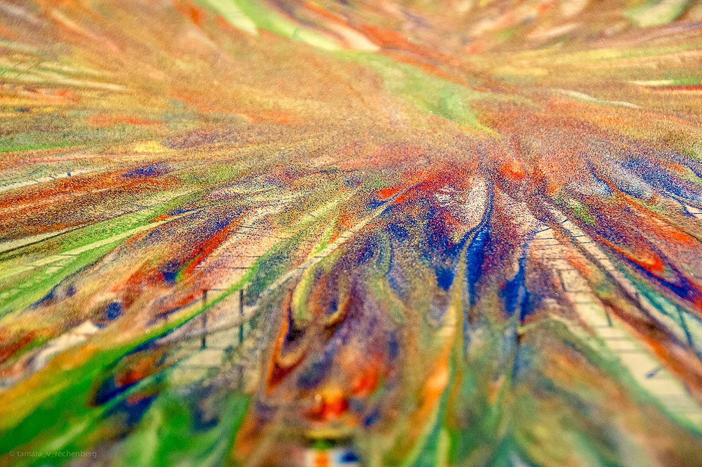 Im tibetischen Buddhismus werden von Mönchen in Form eines Mandala ein Sandbild gestaltet.