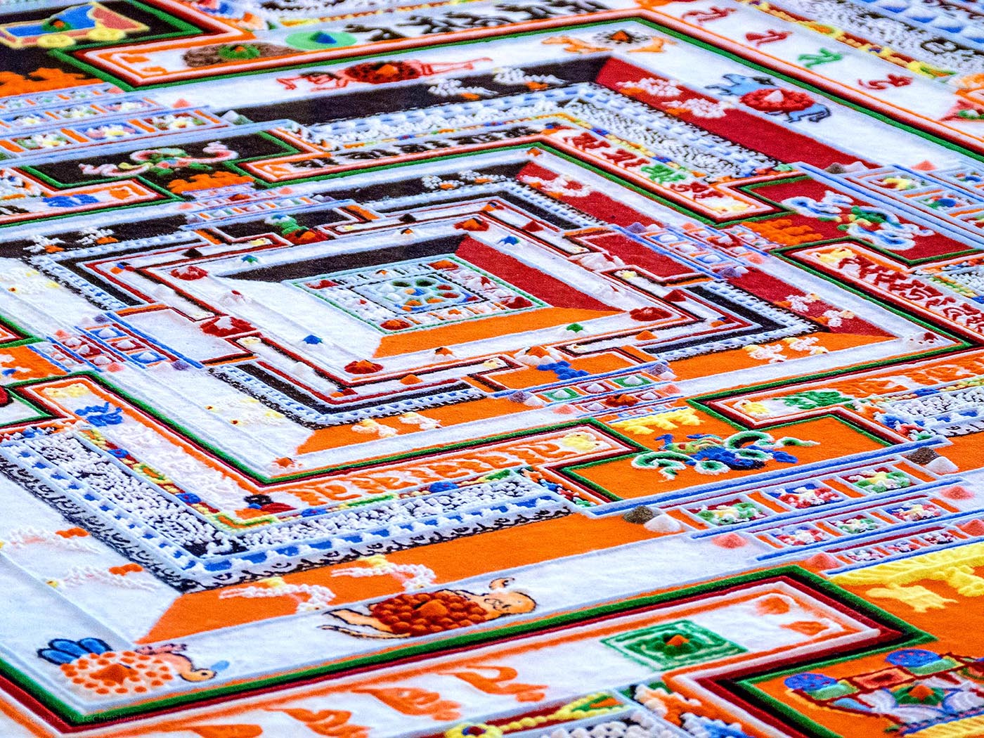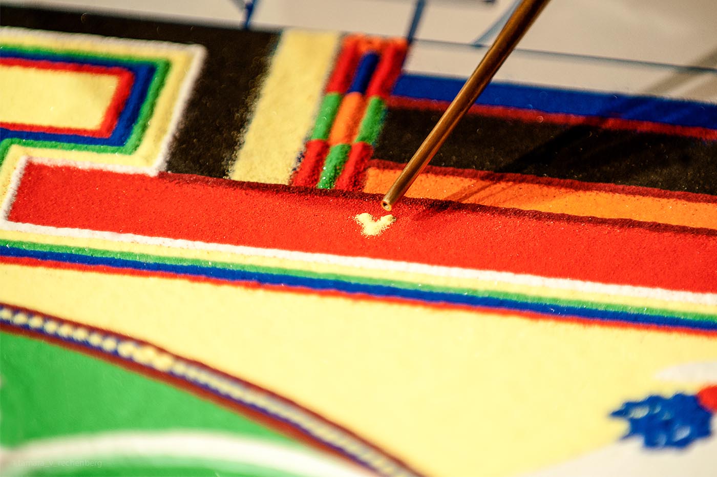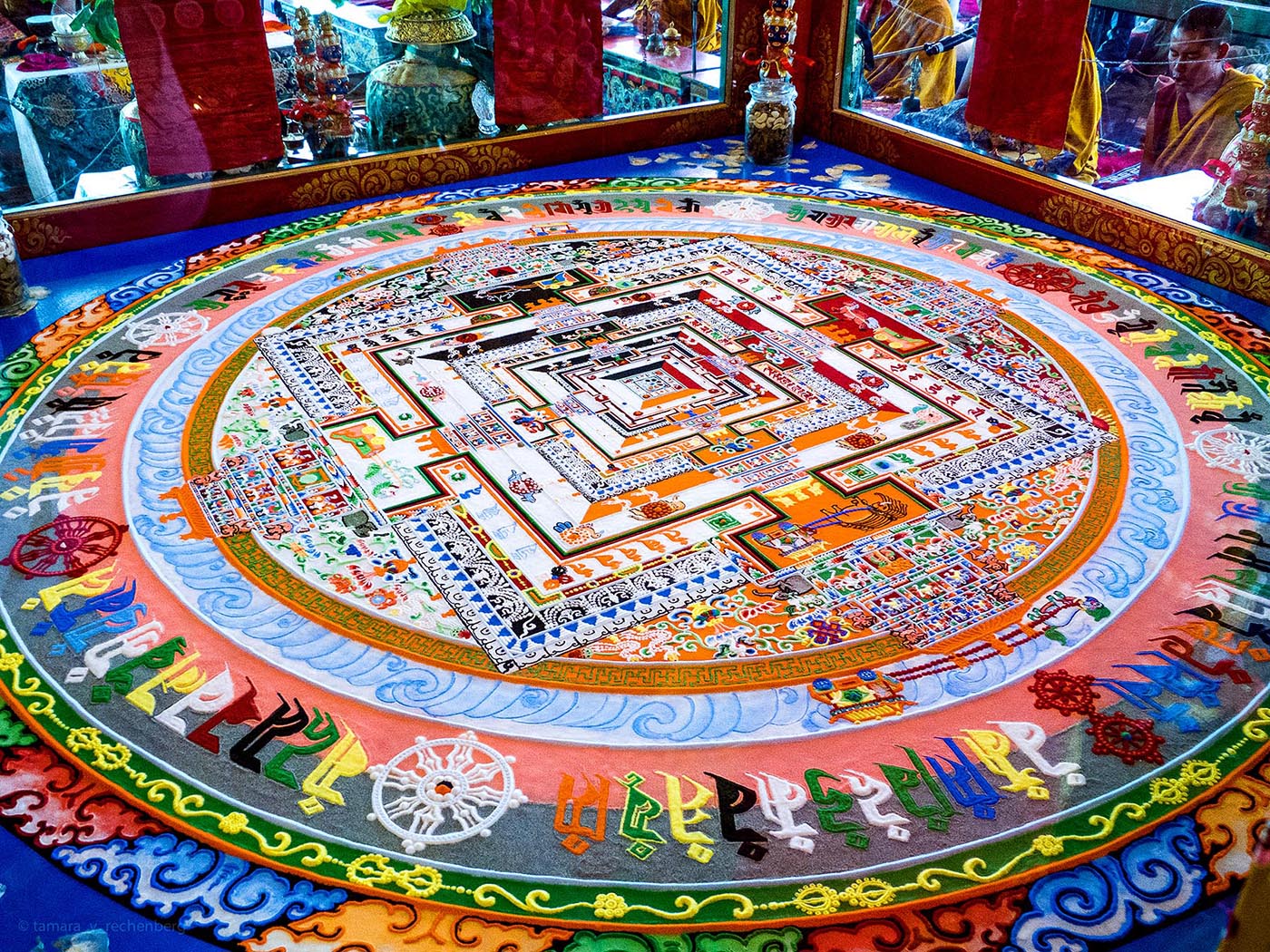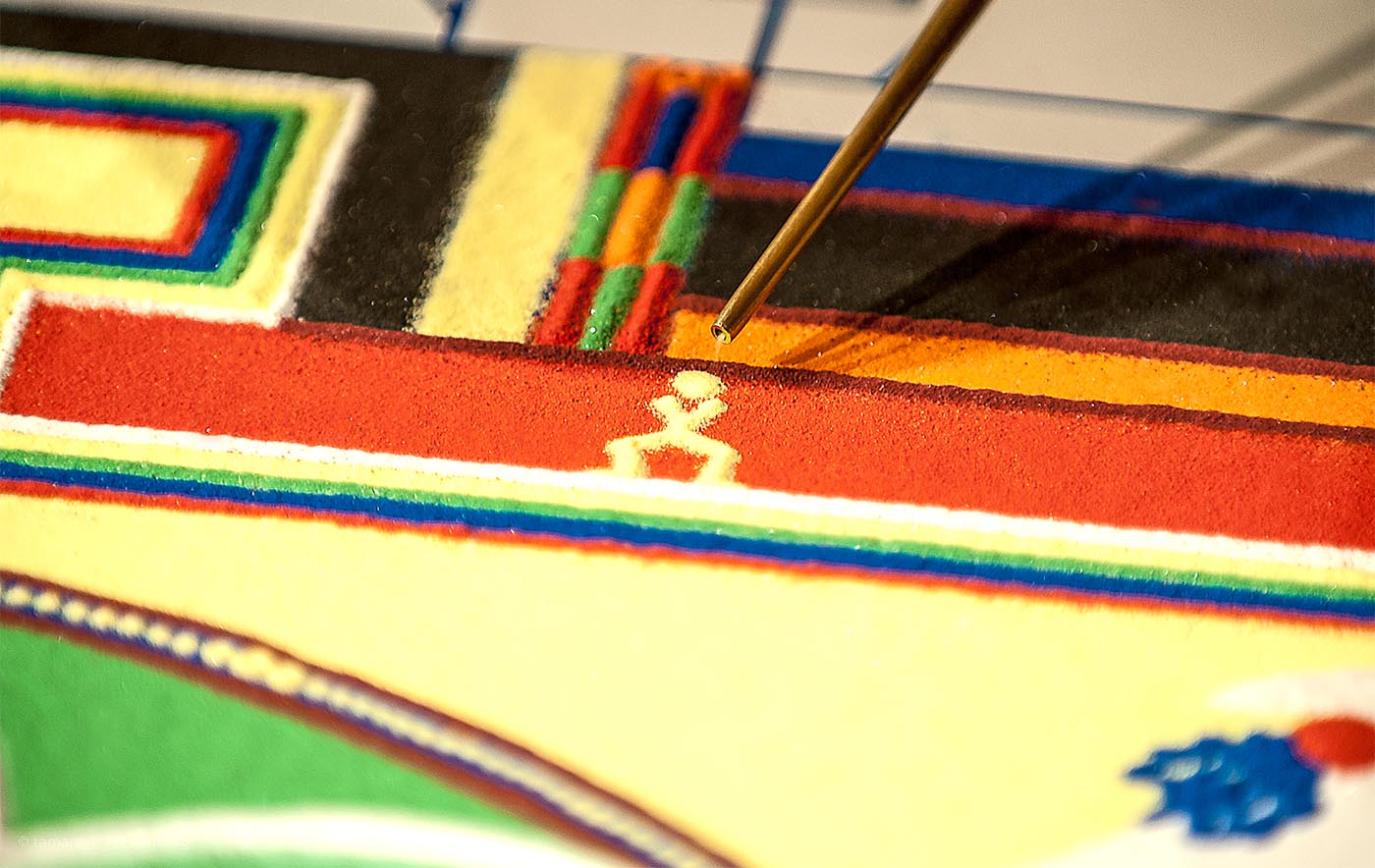 Dieses detailreiche gestreute Sandmandala wird am Ende von mehreren Tagen rituell wieder zerstört.