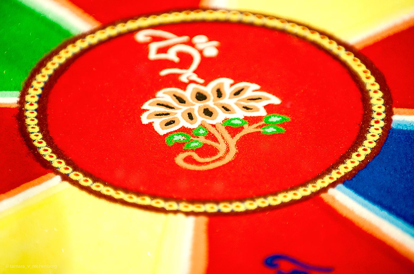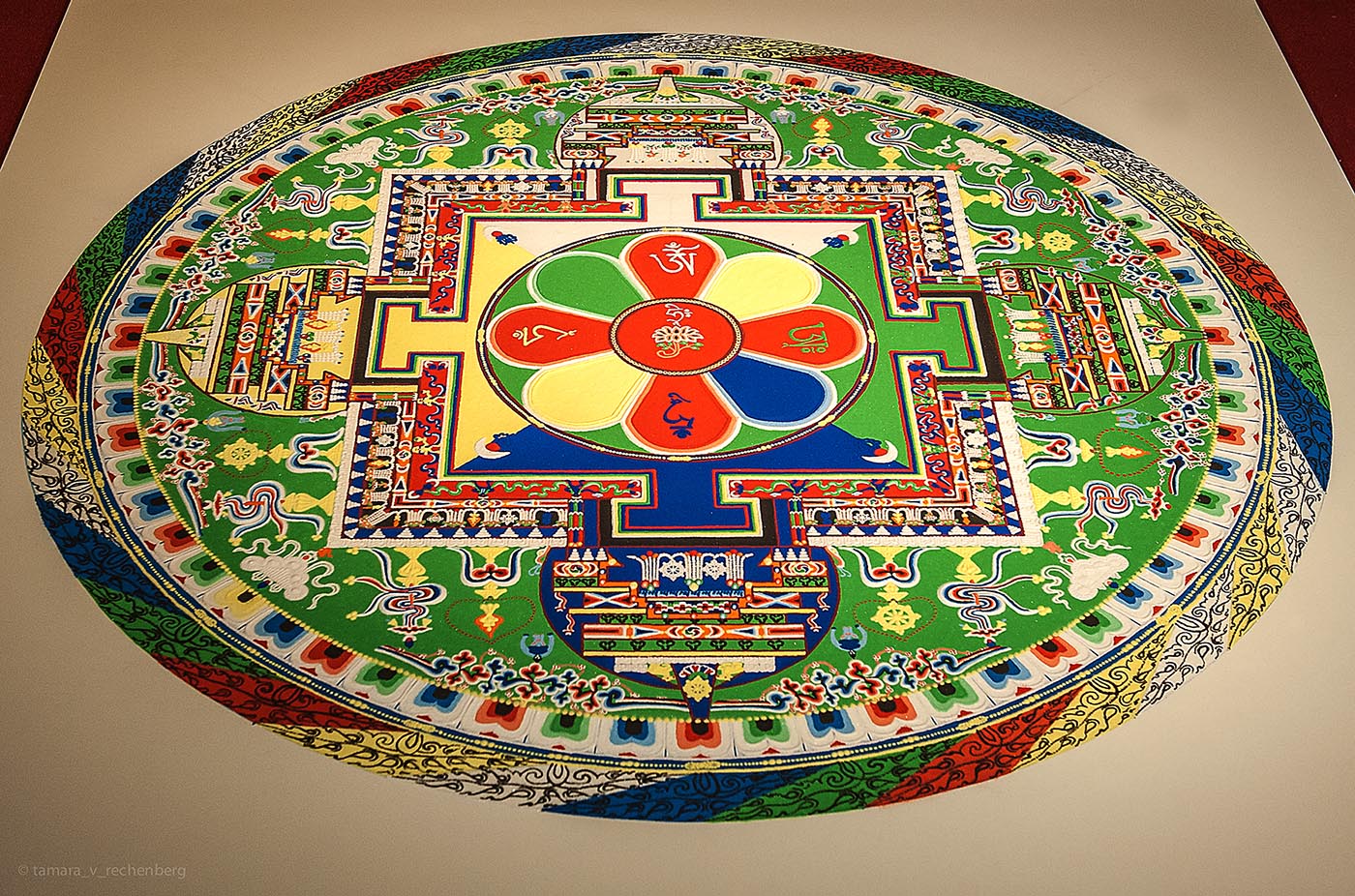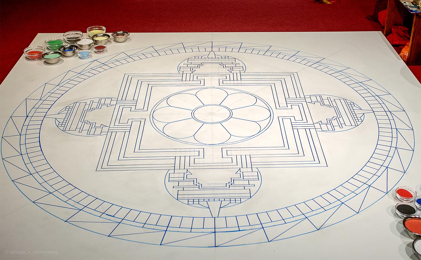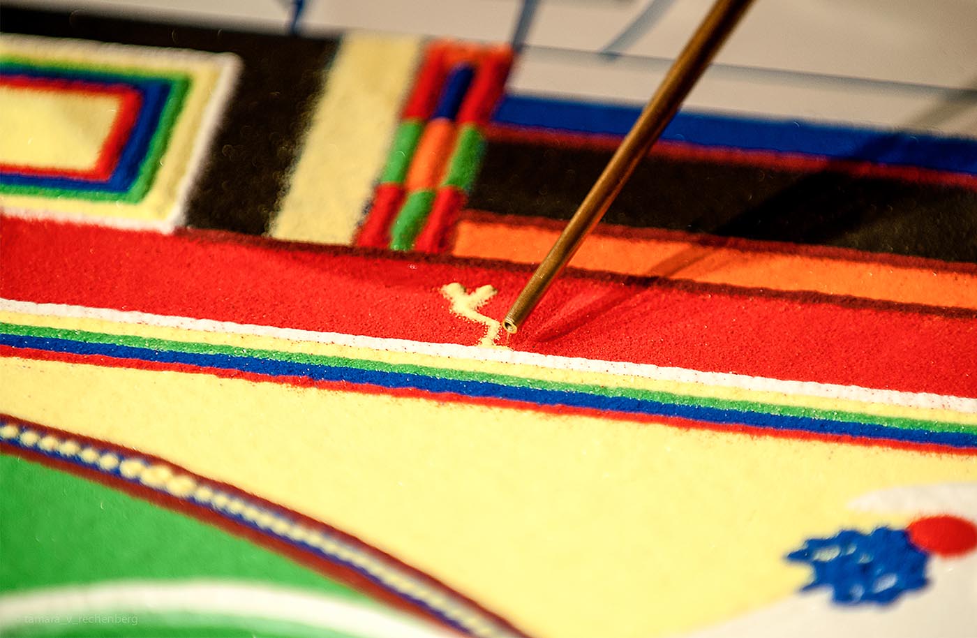 Dieses detailreiche gestreute Sandmandala wird am Ende von mehreren Tagen rituell wieder zerstört.