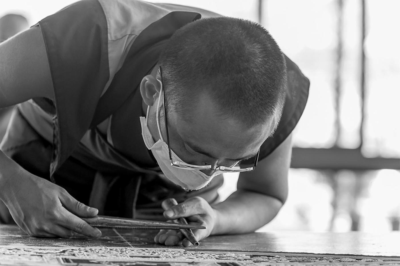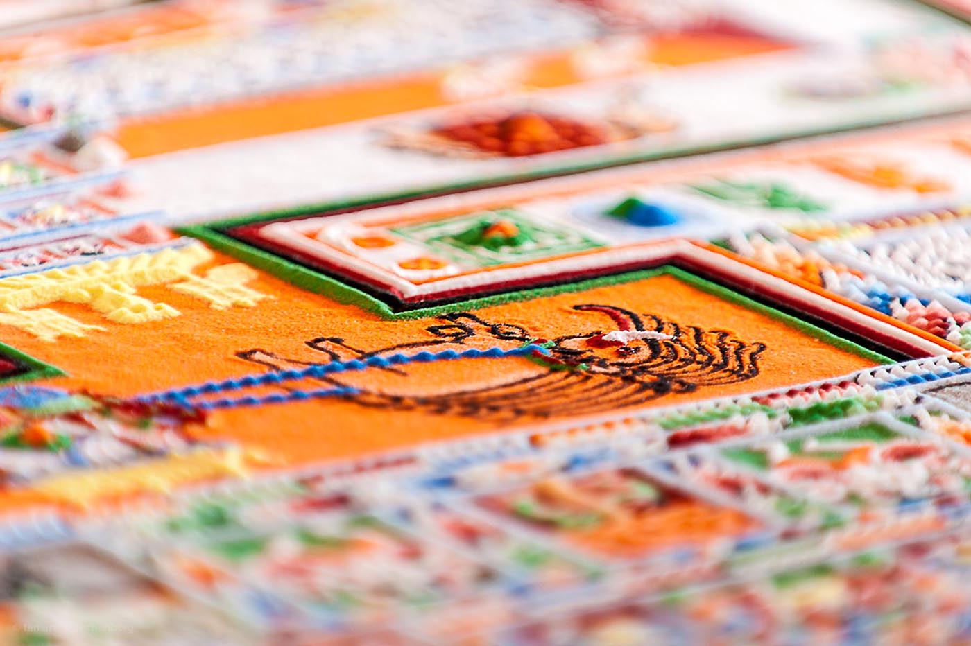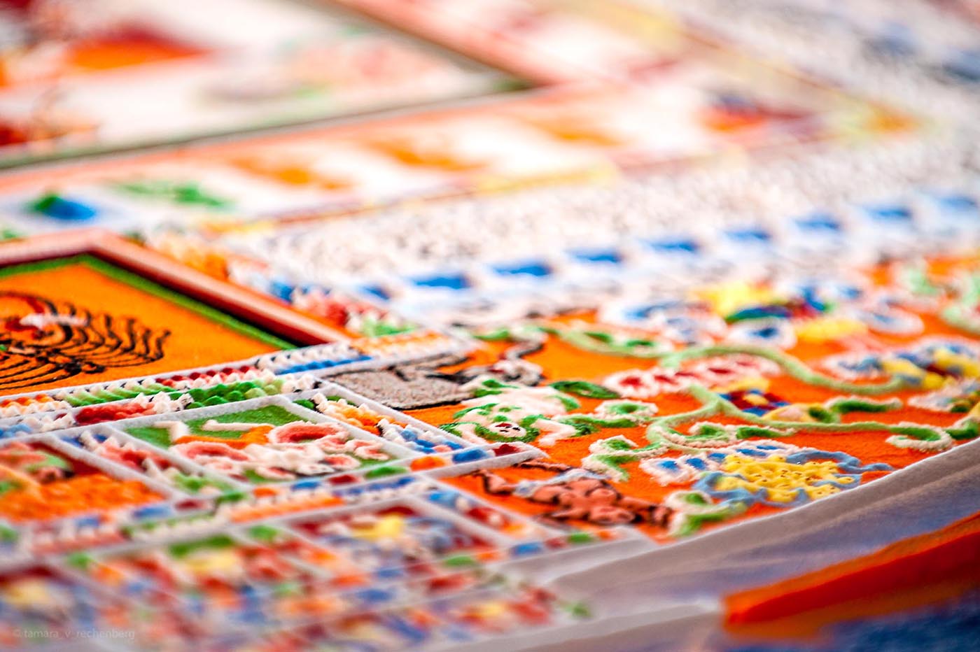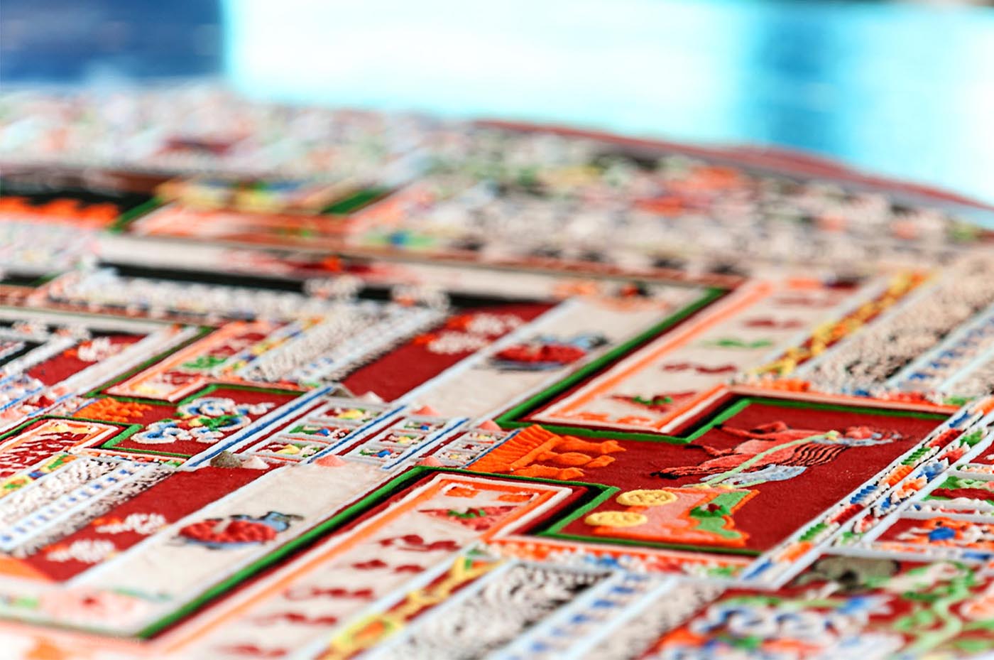 Dieses detailreiche gestreute Sandmandala wird am Ende von mehreren Tagen rituell wieder zerstört.