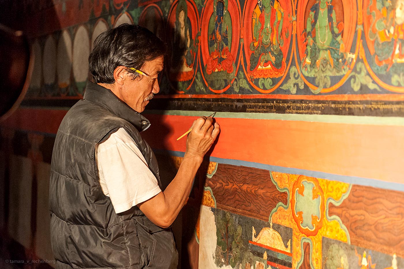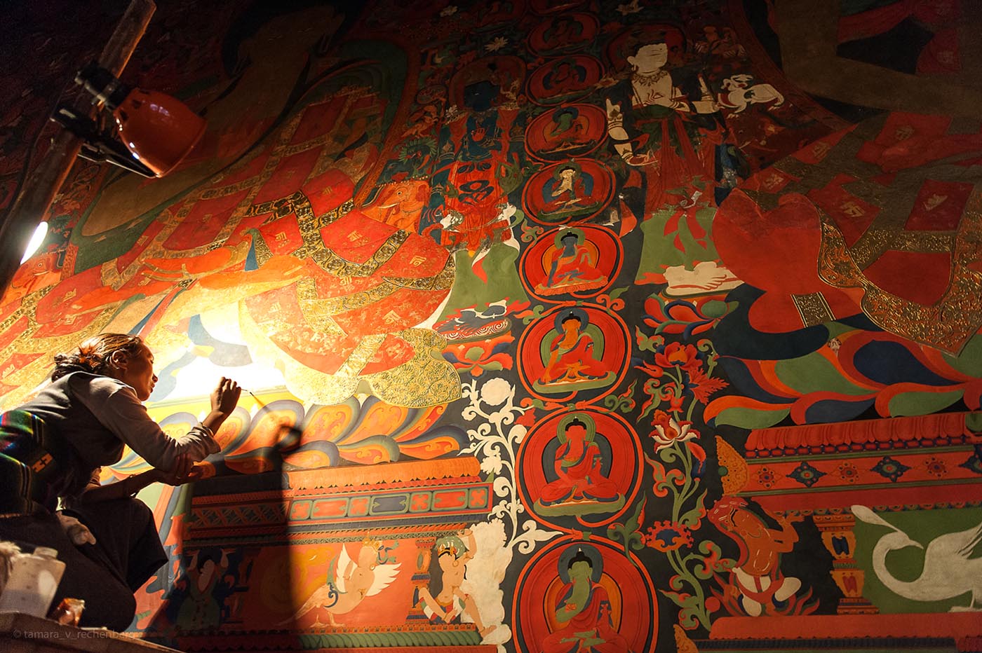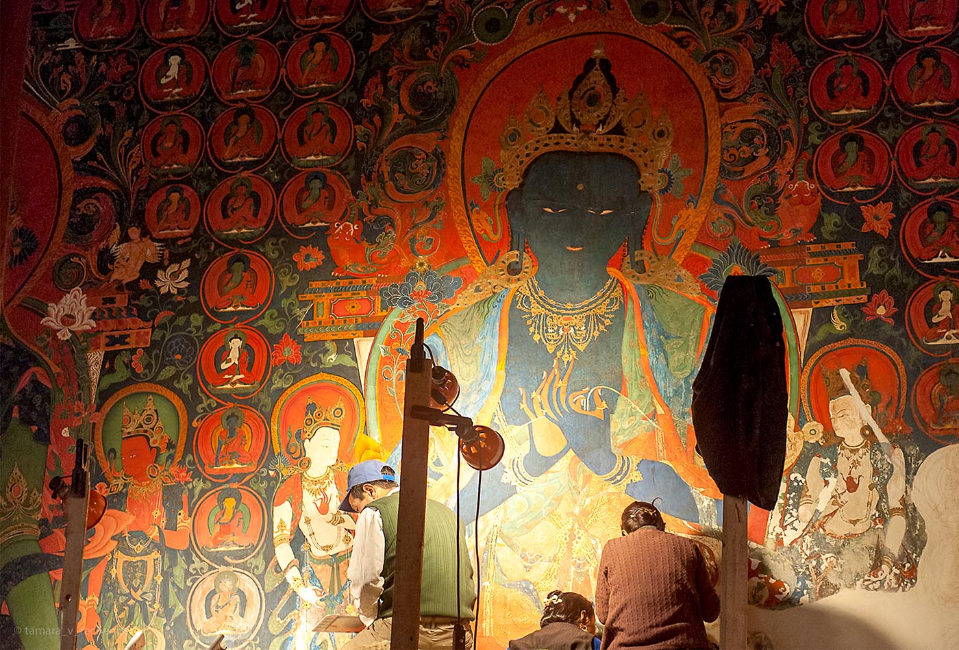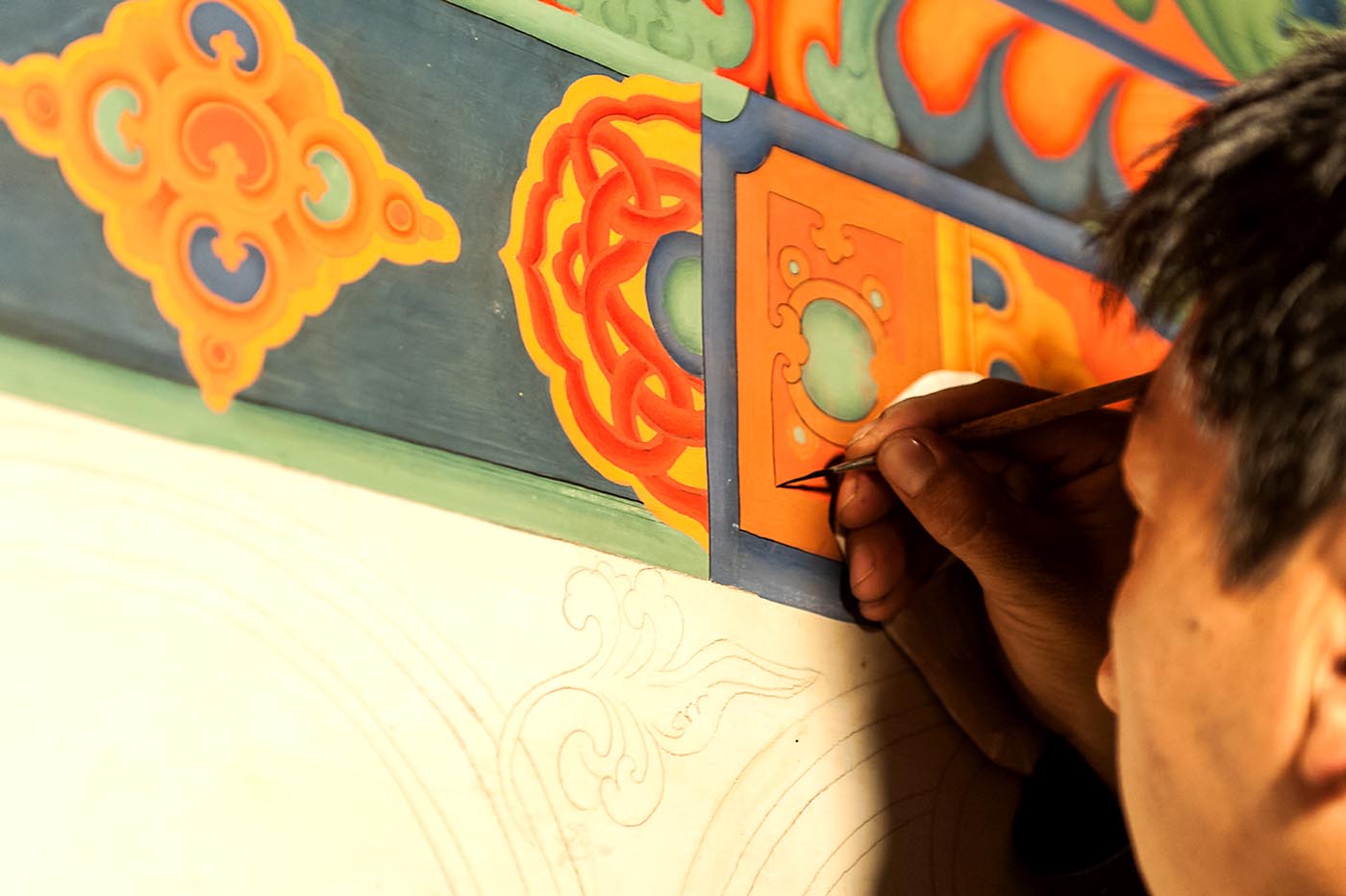 Dieses detailreiche gestreute Sandmandala wird am Ende von mehreren Tagen rituell wieder zerstört.